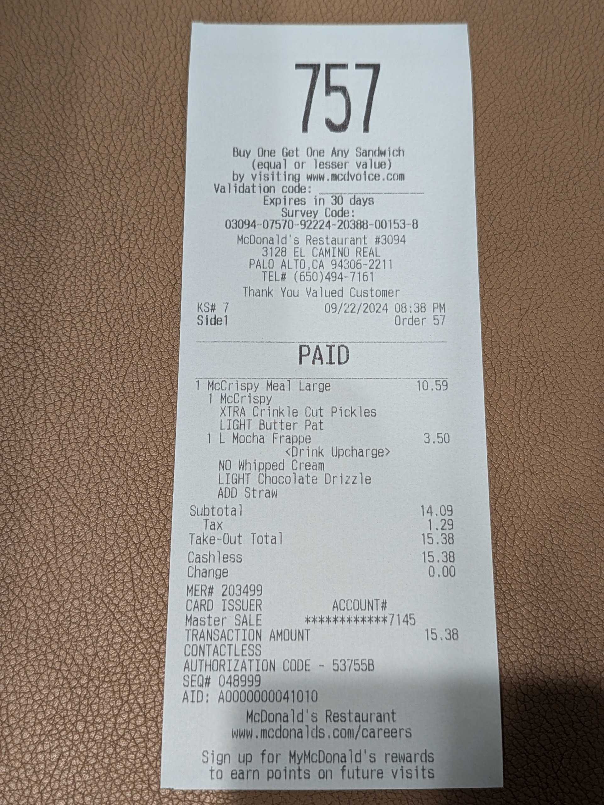The provided receipt is from McDonald’s Restaurant #3094, located at 3128 El Camino Real, Palo Alto, CA. The order was placed on September 22nd, 2024.
