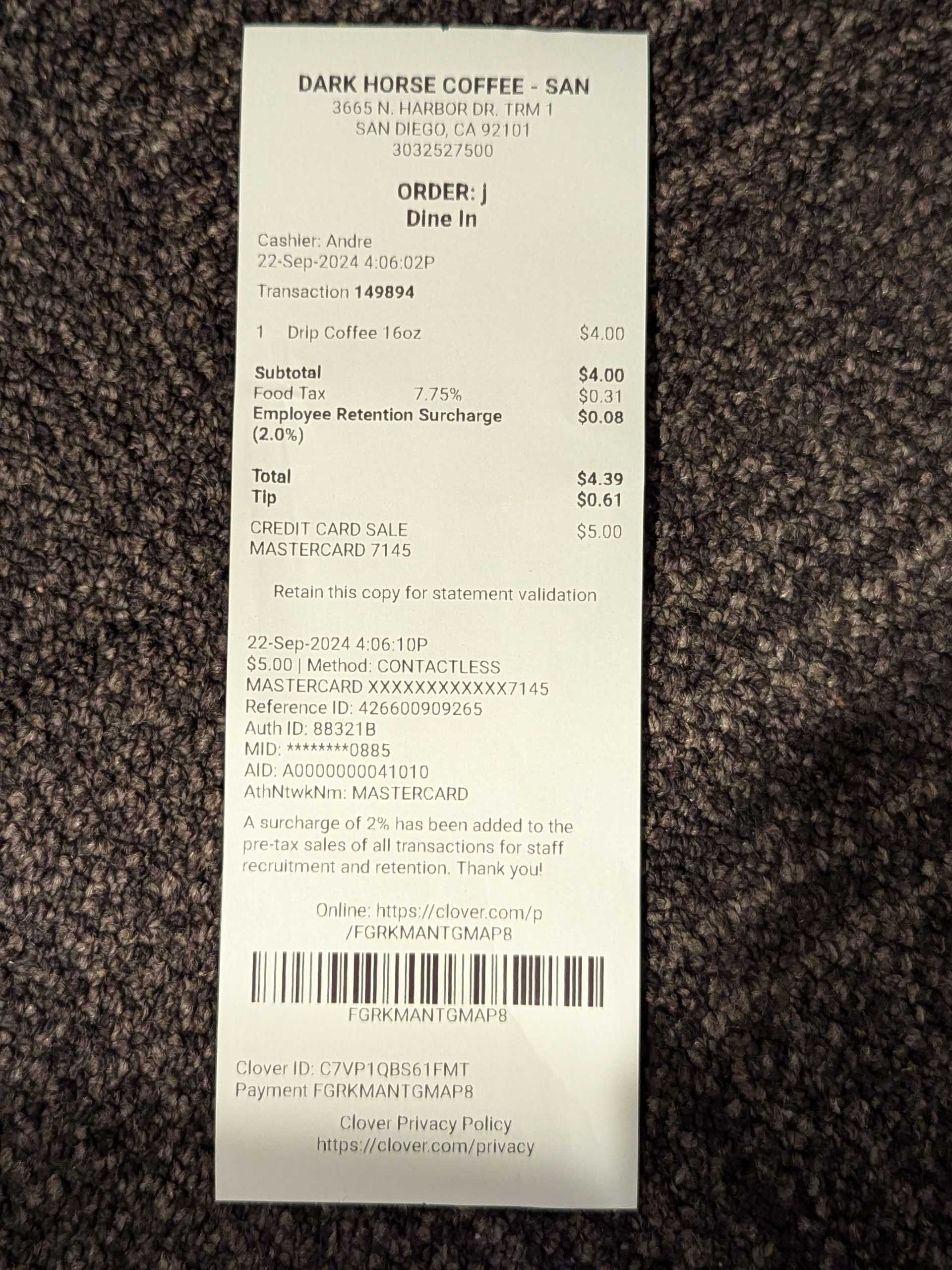 The provided receipt is from Dark Horse Coffee - San Diego, California. The receipt includes a subtotal of $4.00 for one Drip Coffee 16oz.