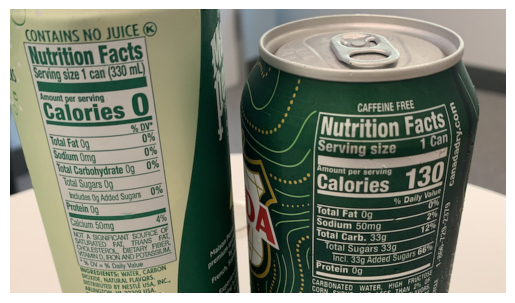 - I identified the sections where the nutritional facts are mentioned for each drink. The nutrition facts are listed on both cans, but the information is not clearly visible due to the image quality.