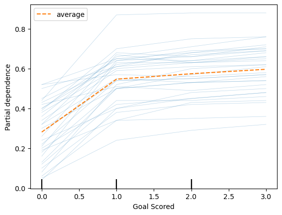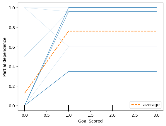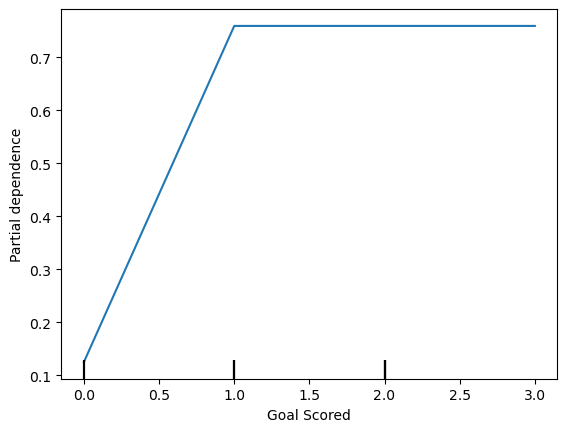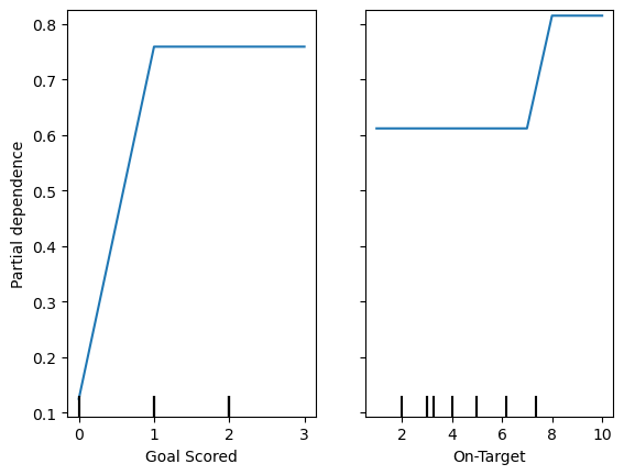 PartialDependenceDisplay.from_estimator(model_dt, df_val, ['Goal Scored', 'On-Target'])