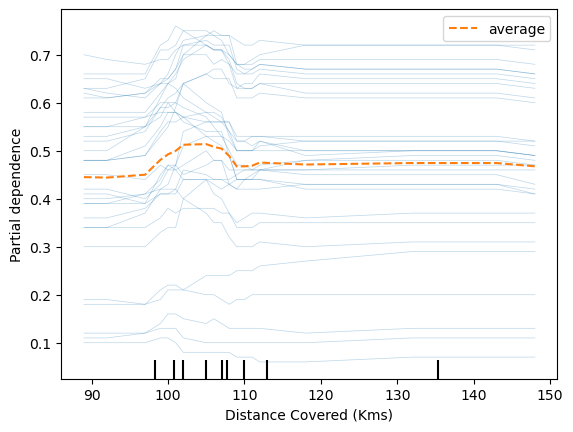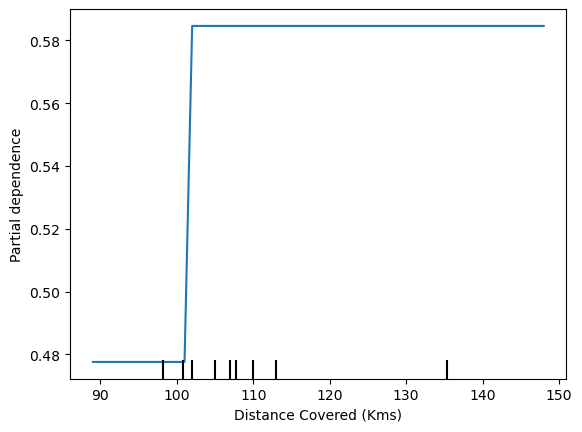 PartialDependenceDisplay.from_estimator(model_dt, df_val, ['Distance Covered (Kms)'])