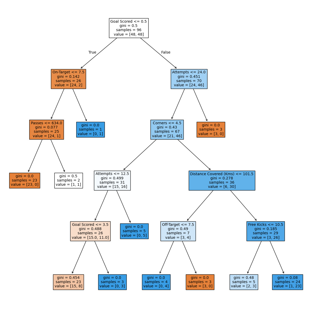 plot_tree(model_dt,filled=True,feature_names=df_train.columns.tolist(),fontsize=10,ax=ax);