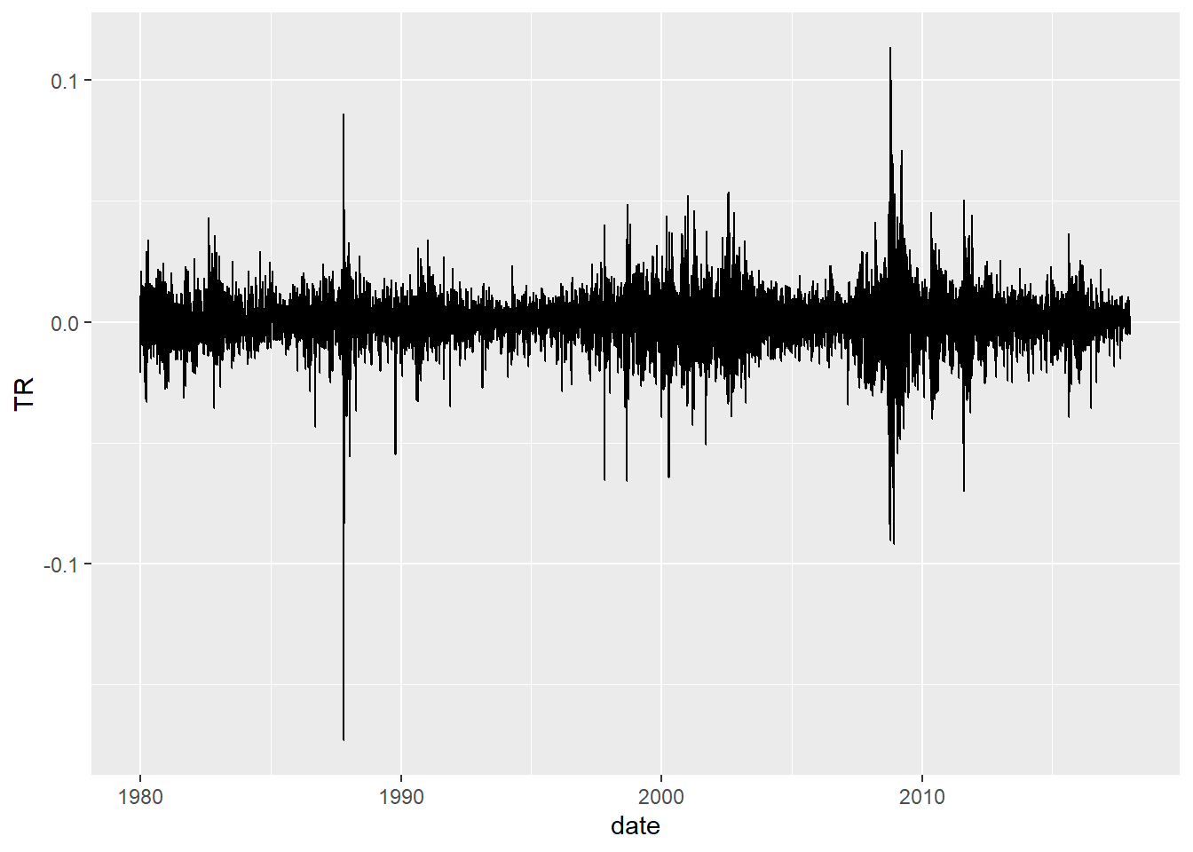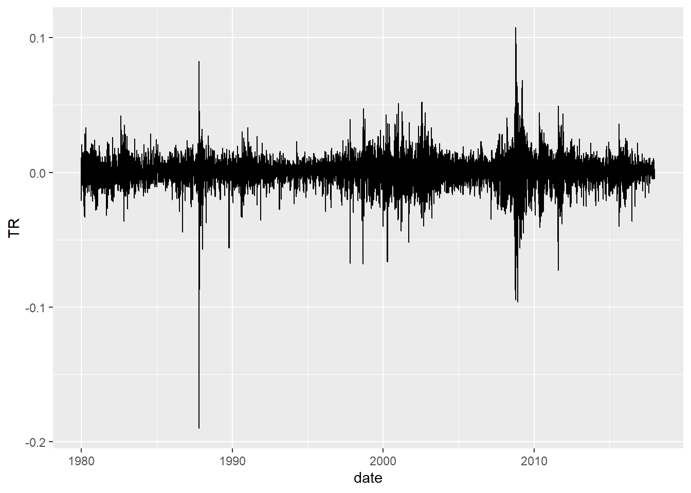 Clearly first few years have one point per month. Based on we will choose a duration to retrieve data where we have daily data available on weekdays starting from 1980 upto December 2017 end. Reason for this range is to ensure reproducible results for our calculations.