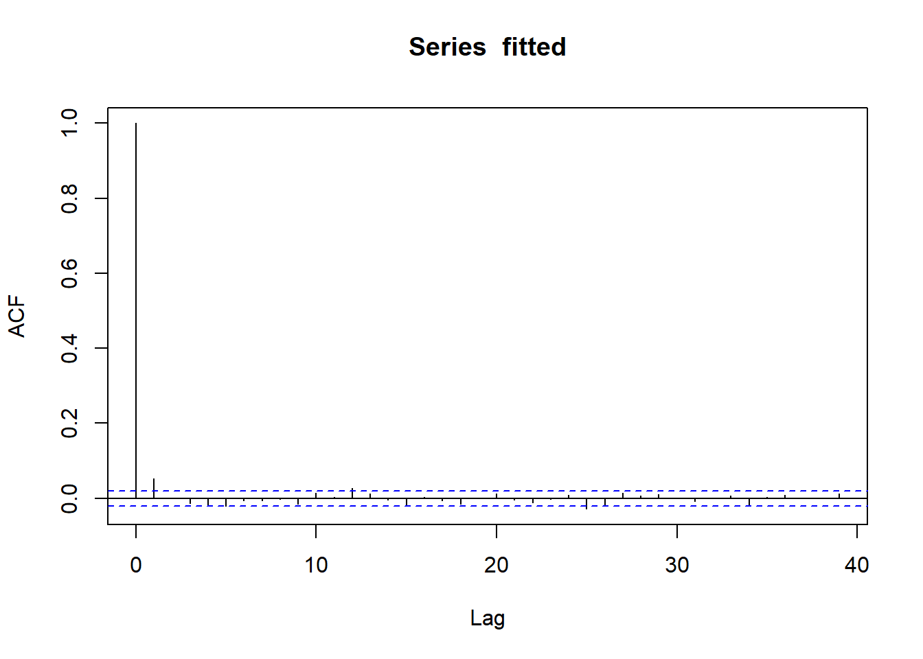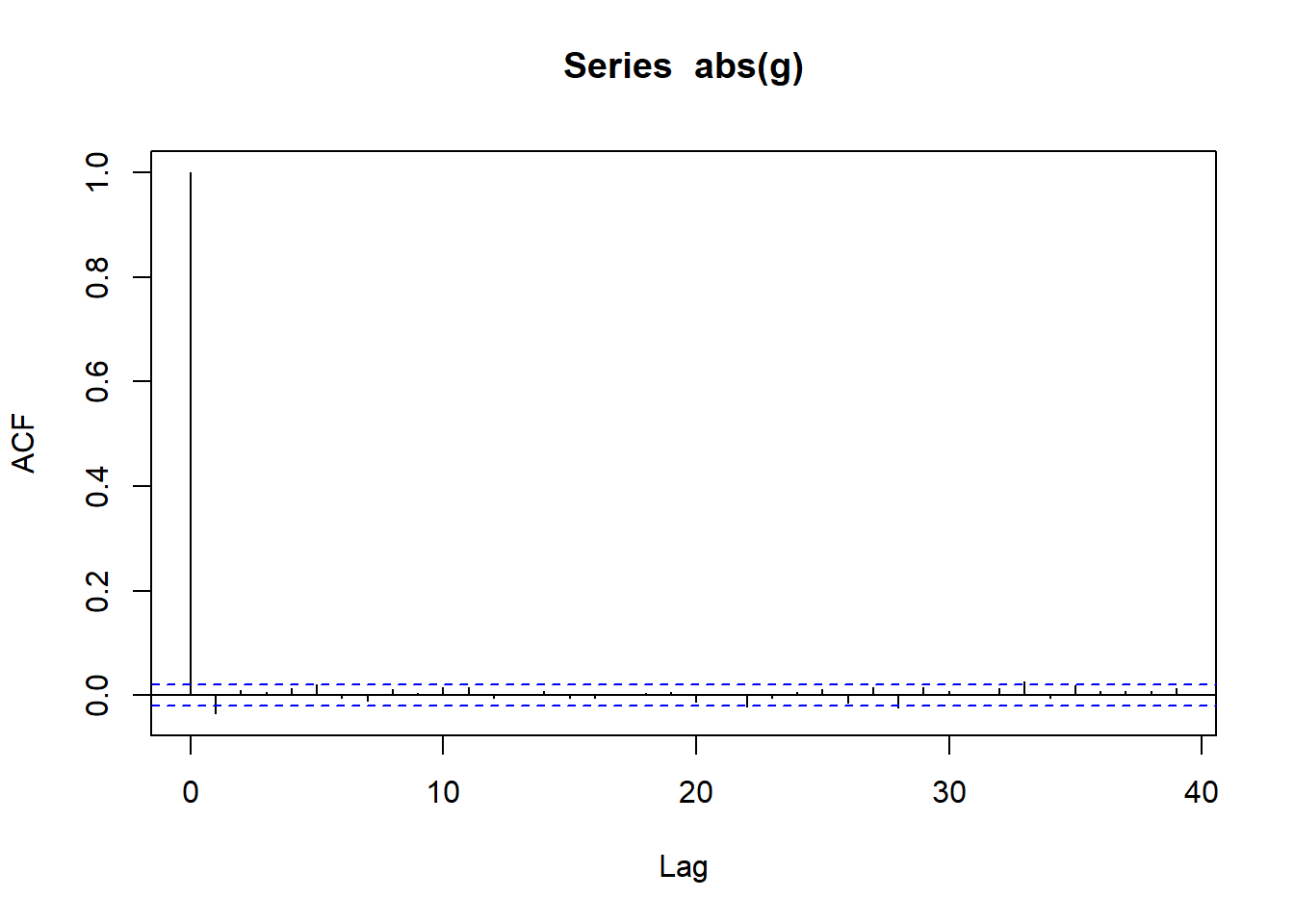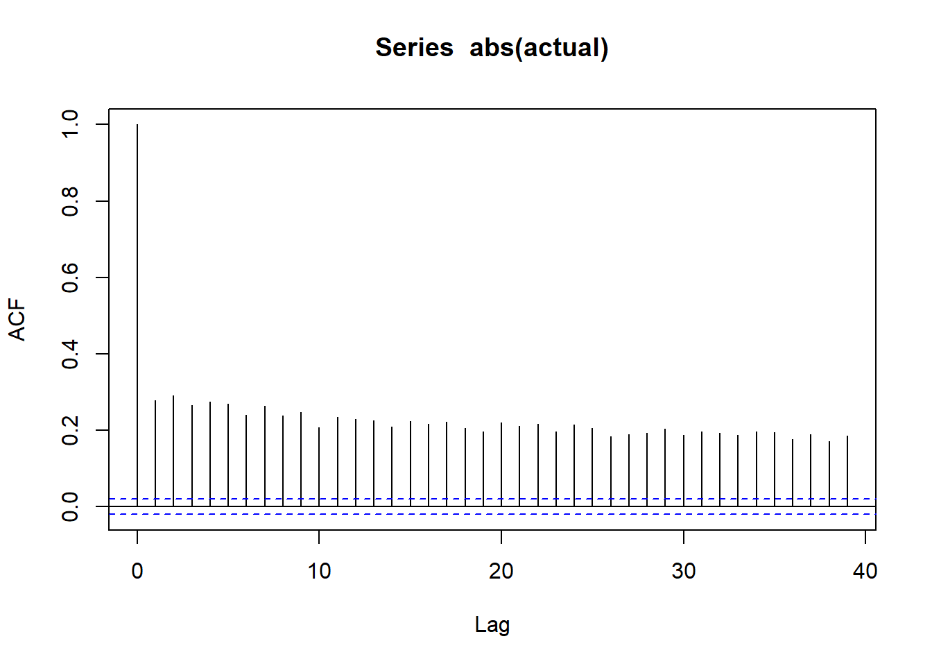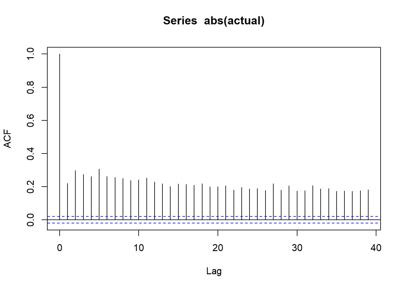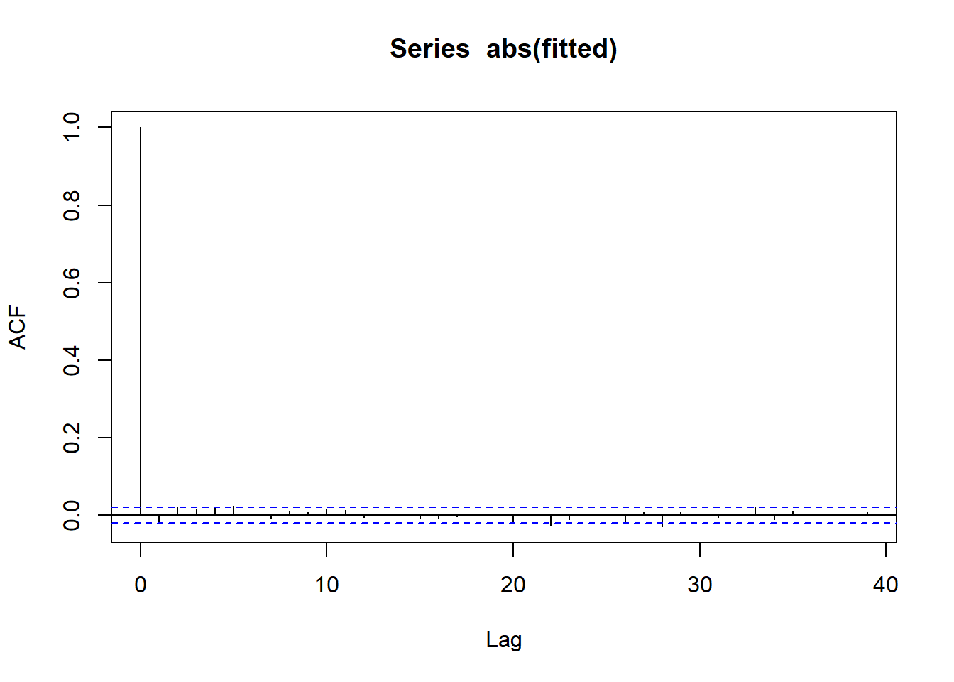 ACF curves for absolute fitted value indicate no serial correlation and thus, no volatility clustering => Variance equation in GARCH model is able to explain all volatility clustering in our data