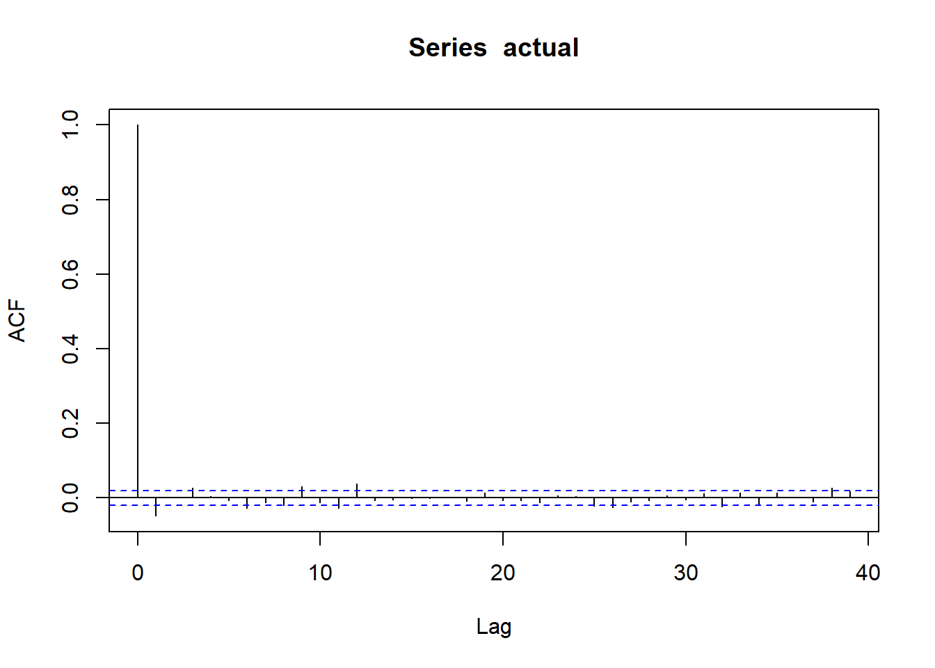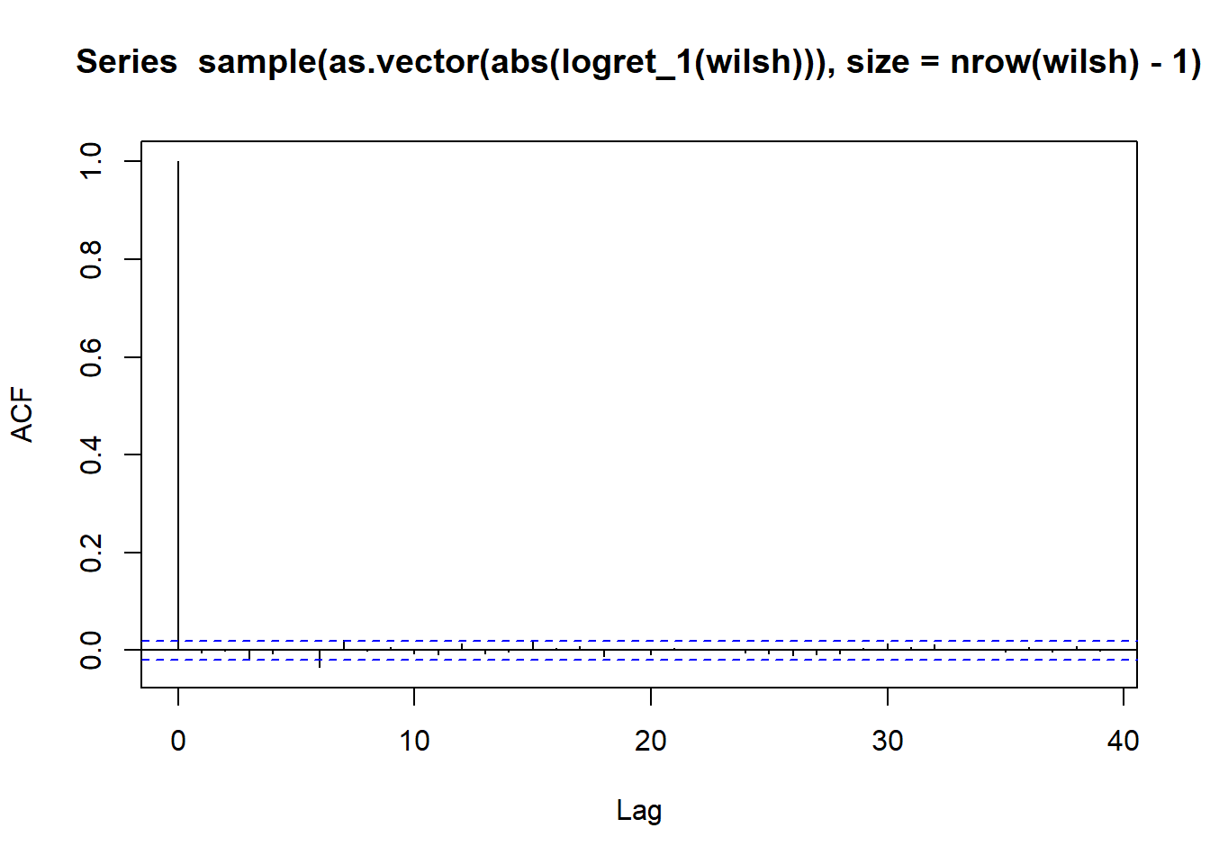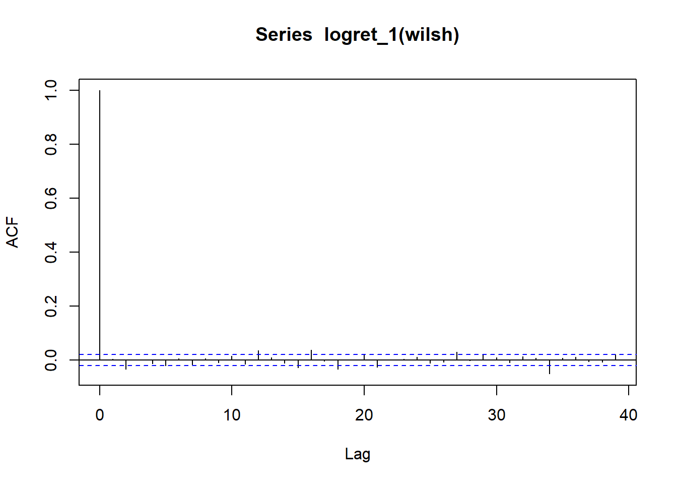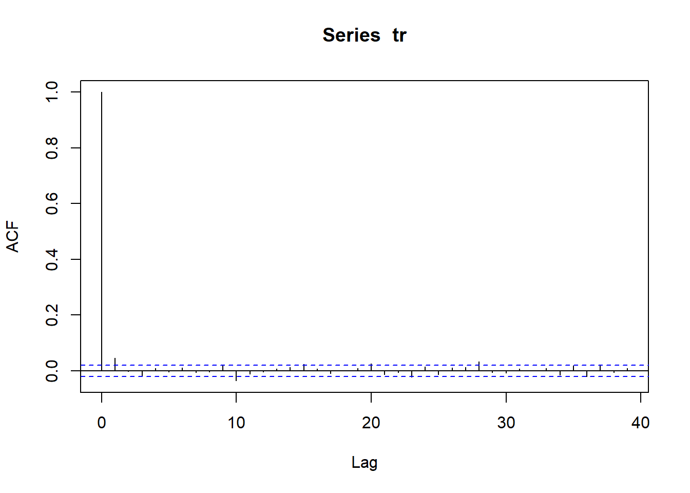 Above plot shows , We do not find much evidence of serial correlation in the daily log returns of the Wilshire 5000 index. That means the direction of stock prices are not predictable.