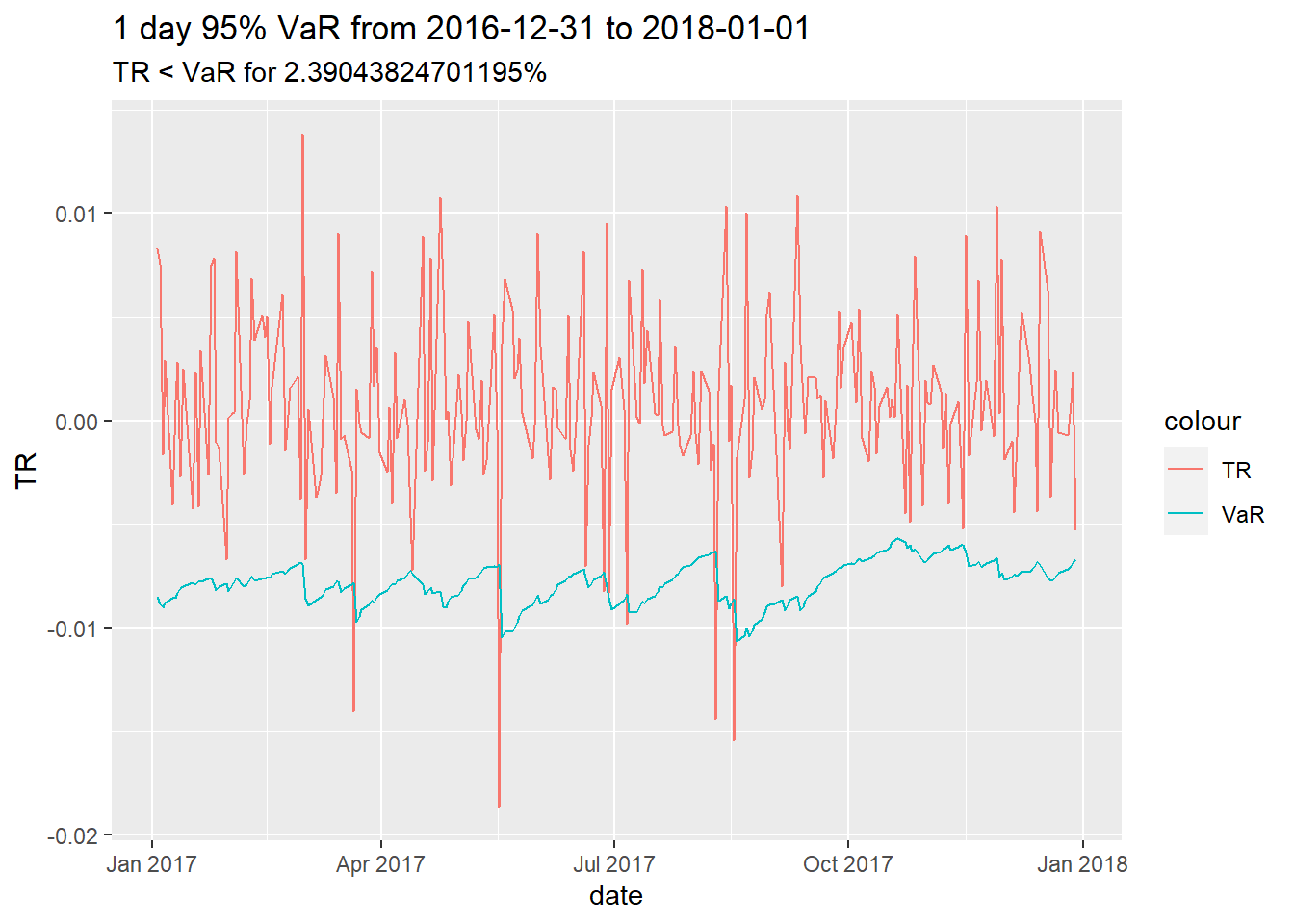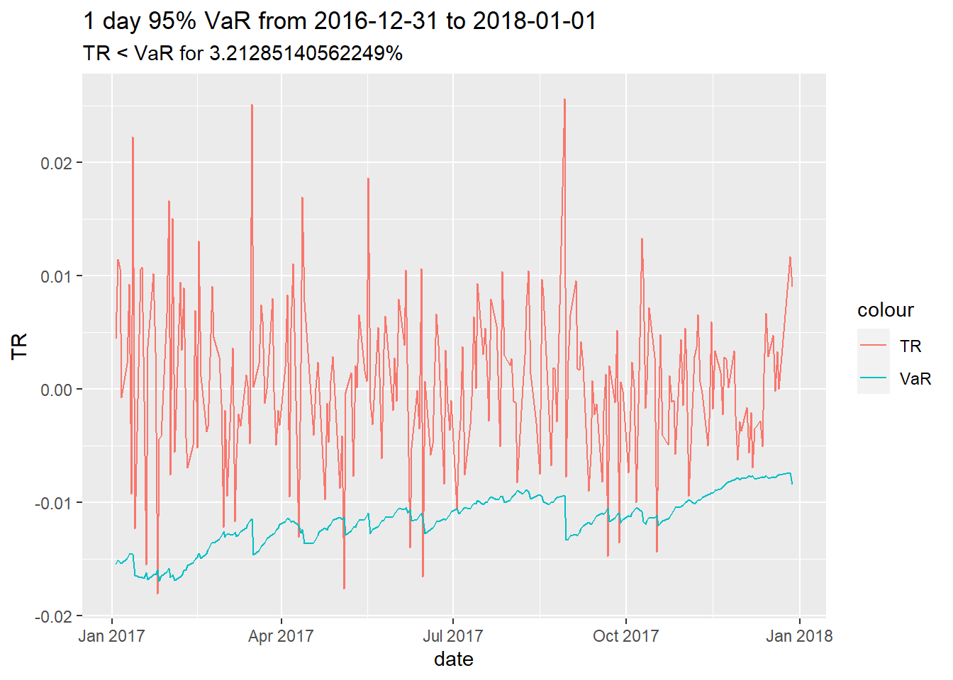 filterSeries <-function(s, date_filter="1979-12-31/2017-12-31", new_name='TR'){ s <-na.omit(s); s s <- s[date_filter]; snames(s) <- new_name; sreturn(s)}getSeries <-function(name, date_filter="1979-12-31/2017-12-31", src='FRED', new_name='TR', auto.assign=FALSE){ s <-getSymbols(name, src=src, auto.assign = auto.assign); s s <-filterSeries(s)return(s)}get_df <-function(tbl){ df <-data.frame(date=index(tbl), TR=as.numeric(tbl$TR))return(df)}logret_1 <-function(tbl){return(diff(log(tbl))[-1])}aggr_fn <-function(tbl, fn){ result <-fn(tbl, sum)return(result)}logret_w <-partial(aggr_fn, fn = apply.weekly)logret_m <-partial(aggr_fn, fn = apply.monthly)logret_q <-partial(aggr_fn, fn = apply.quarterly)logret_a <-partial(aggr_fn, fn = apply.yearly)logret_ndays <-function(tbl, days=10){ len_tbl <- (nrow(tbl)-days+1) new_TR <-sapply(seq(1:len_tbl), function(i){sum(tbl[i:(i+days-1)]) }) tbl[1:len_tbl]$TR <- new_TRreturn(tbl[1:len_tbl])}ret <-function(logret){return(exp(logret)-1)}get_norm_series <-function(mu, sig, n=100000, set_seed=TRUE){if (set_seed){RNGkind(sample.kind="Rounding")set.seed(123789) }return(rnorm(n,mu, sig)) }get_sim_series <-function(s, n=100000, set_seed=TRUE){if (set_seed){RNGkind(sample.kind="Rounding")set.seed(123789) }return(sample(as.vector(s), n, replace=TRUE))}get_t_series <-function(mu, sig, df, n=100000, set_seed=TRUE){if (set_seed){RNGkind(sample.kind="Rounding")set.seed(123789) }return(rt.scaled(n,mean=mu,sd=sig,df=df)) }get_norm_series_from_s <-function(s, n=100000, set_seed=TRUE){ mu =mean(s) sig =sd(s)return(get_norm_series(mu, sig, n=n, set_seed = set_seed))}get_fit_params <-function(s){ fitpars <- s |>as.vector() |>fitdistr(densfun='t') return(fitpars)}get_t_series_from_s <-function(s, n=100000, fitpars=NULL, set_seed=TRUE){if(is.null(fitpars)){ fitpars <- s |>get_fit_params() } t.fit <- fitparsreturn(get_t_series(mu=t.fit$estimate[1], sig=t.fit$estimate[2], df=t.fit$estimate[3], n=n, set_seed=set_seed))}get_sim_VaR <-function(s, alpha=0.05){return(quantile(s, alpha) |>unname())}get_sim_ES <-function(s, VaR){# VaR <- get_sim_VaR(s, alpha=alpha)return(mean(s[s<VaR]))}get_VaR <-function(tbl,alpha=0.05){ mu =mean(tbl) sig =sd(tbl) VaR =qnorm(alpha, mean=mu, sd=sig) #quantile of normal distribution(only not for any other distribution)return(VaR)}get_ES <-function(tbl, alpha=0.05){ mu =mean(tbl) sig =sd(tbl) ES = mu - sig*dnorm(qnorm(alpha, mean=0, sd=1), 0, 1)/alpha #quantile of normal distribution(only not for any other distribution)return(ES)}expected_loss <-function(portfolio, risk_num){ #95% confidence that we won't loose more than this amountreturn(portfolio*(exp(risk_num)-1))}err <-function(a, b){return((a-b)/a*100)}get_dist_plot <-function(tbl){ mu =mean(tbl) sig =sd(tbl) p <-get_df(tbl) |>ggplot(mapping =aes(x=TR)) +geom_histogram(aes(y=after_stat(density)), colour="black", fill="white", bins=100)+geom_density(alpha=.2, fill="violet") +geom_vline(aes(xintercept=mu),color="brown", linetype="dashed", linewidth=1) +geom_vline(aes(xintercept=mu+2*sig),color="brown", linetype="dashed", linewidth=0.1) +geom_vline(aes(xintercept=mu-2*sig),color="brown", linetype="dashed", linewidth=0.1) +labs(title=glue("Distribution of TR: mu={round(mu, 8)}, sigma={round(sig, 8)}"), y='count')return(p)}get_VaR_plot <-function(tbl, alpha=0.05){ mu =mean(tbl) sig =sd(tbl) VaR =qnorm(alpha, mean=mu, sd=sig) p <-get_df(tbl) |>ggplot(mapping =aes(x=TR)) +geom_histogram(aes(y=after_stat(density)), colour="black", fill="white", bins=100)+geom_density(alpha=.2, fill="violet") +geom_vline(aes(xintercept=mu),color="brown", linetype="dashed", linewidth=1) +geom_vline(aes(xintercept=VaR),color="brown", linewidth=1) +labs(title=glue("Distribution of TR: mu: {round(mu, 8)}, sigma: {round(sig, 6)}, VaR({alpha}): {round(VaR, 6)}"), y='count')return(p)}get_comp_plot <-function(s, alpha=0.05){ mu <-mean(s) sig <-sd(s) norm_s <-get_norm_series(mu, sig) VaR <- norm_s |>get_sim_VaR(); VaR ES <- norm_s |>get_sim_ES(VaR=VaR); ES s_sim <- s |>get_sim_series() VaR_sim <- s_sim|>get_sim_VaR(); VaR_sim ES_sim <- s_sim |>get_sim_ES(VaR=VaR_sim); ES_sim err_VaR <-err(VaR, VaR_sim) |>round(digits =2) err_ES <-err(ES, ES_sim) |>round(digits =2) p <-data.frame(TR=s_sim, TR2=norm_s) |>ggplot() +geom_density(mapping =aes(x=TR), alpha=.2, fill="violet") +geom_density(mapping =aes(x=TR2), alpha=.2, fill="white") +geom_vline(aes(xintercept=ES_sim),color="brown", linetype="dashed", linewidth=1) +geom_vline(aes(xintercept=ES),color="blue", linetype="dashed", linewidth=1) +geom_vline(aes(xintercept=VaR_sim),color="brown", linewidth=1) +geom_vline(aes(xintercept=VaR),color="blue", linewidth=1) +labs(title=glue("Distribution of TR alpha({alpha}): \n VaR_norm(blue): {round(VaR, 6)},VaR_sim(brown): {round(VaR_sim, 6)}, Error: {round(err(VaR, VaR_sim), 2)}% \n ES_norm: {round(ES, 6)},ES_sim: {round(ES_sim, 6)}, Error: {round(err(ES, ES_sim), 2)}%"), y='count')return(p)}do_analysis <-function(s, alpha=0.05){ modelname1 <-"Norm" VaR1 <- s |>get_VaR() |>as.double() ES1 <- s |>get_ES() |>as.double()# df[nrow(df) + 1,] <- c(modelname, VaR, ES) modelname2 <-"NormSim" norm_series <- s |>get_norm_series_from_s() VaR2 <- norm_series|>get_sim_VaR(alpha=alpha) |>as.double() ES2 <- norm_series |>get_sim_ES(VaR=VaR2) |>as.double()# df[nrow(df) + 1,] <- c(modelname, VaR, ES) modelname3 <-"T-Sim" t_series <- s |>get_t_series_from_s() VaR3 <- t_series|>get_sim_VaR(alpha=alpha) |>as.double() ES3 <- t_series |>get_sim_ES(VaR=VaR3) |>as.double()# df[nrow(df) + 1,] <- c(modelname, VaR, ES) modelname4 <-"Sim" sim_series <- s |>get_sim_series() VaR4 <- sim_series|>get_sim_VaR(alpha=alpha) |>as.double() ES4 <- sim_series |>get_sim_ES(VaR=VaR4) |>as.double() model_names <-c(modelname1, modelname2, modelname3, modelname4) VaRs <-c(VaR1, VaR2, VaR3, VaR4) ESs <-c(ES1, ES2, ES3, ES4)return(data.frame(ModelName=model_names, VaR=VaRs, ES=ESs))}get_multi_day_series <-function(s, days=10, sampling_func=get_sim_series, n=100000, set_seed=TRUE){if (set_seed){R
