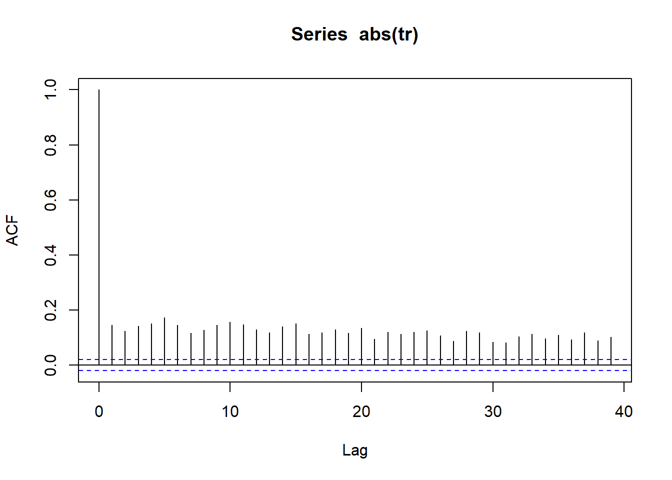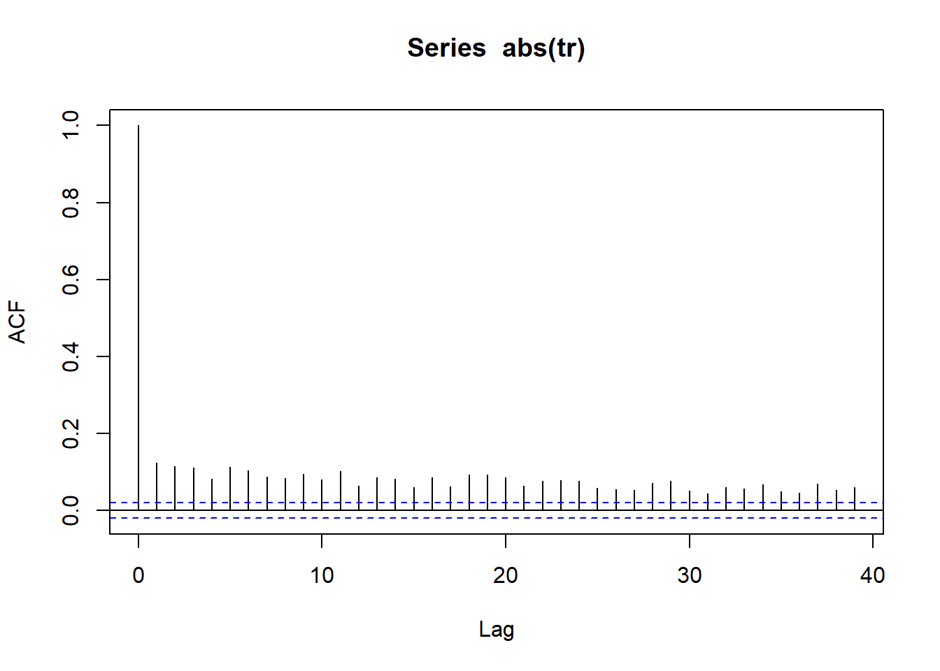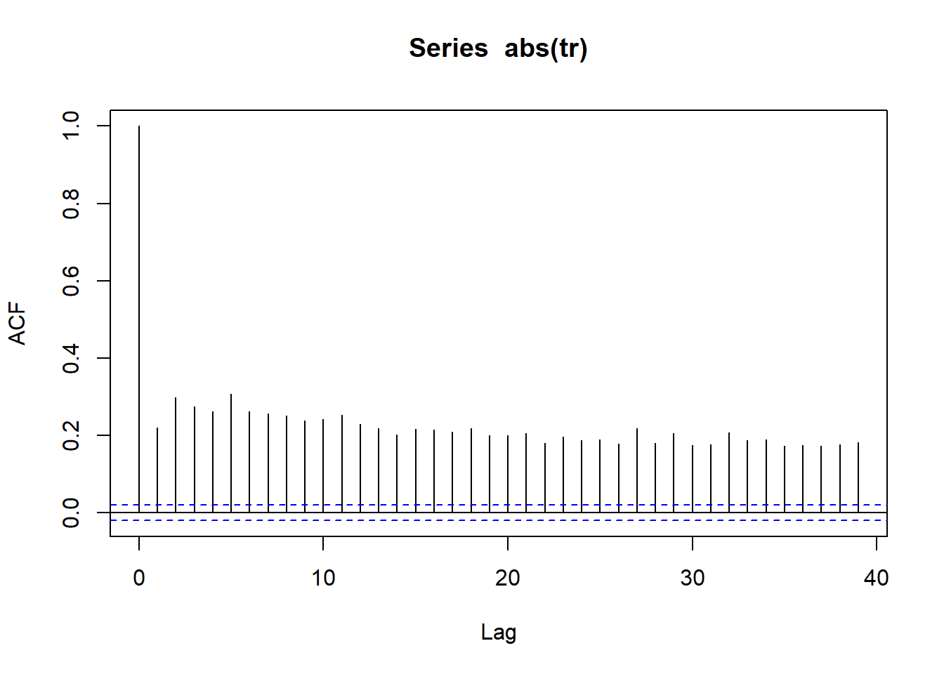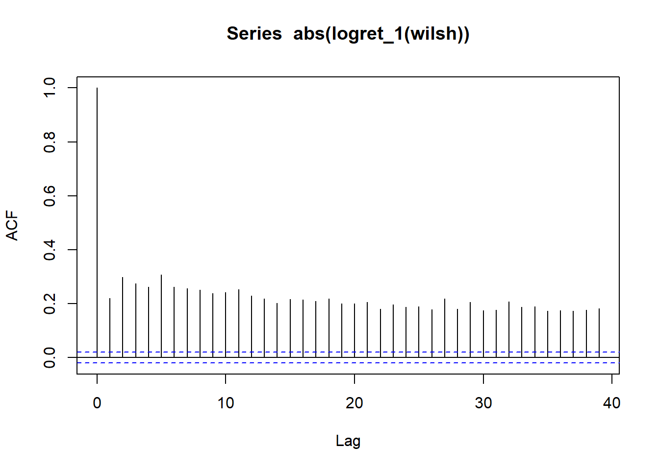Plotting acf on absolute values of logreturns - ( Should show strong evidence of serial correlation )