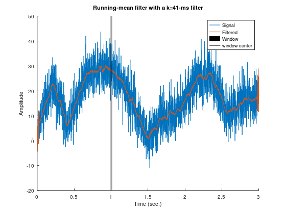 title([ 'Running-mean filter with a k=' num2str(round(windowsize)) '-ms filter' ]);