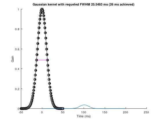 title([ 'Gaussian kernel with requeted FWHM ' num2str(fwhm) ' ms (' num2str(exp_fwhm) ' ms achieved)' ])